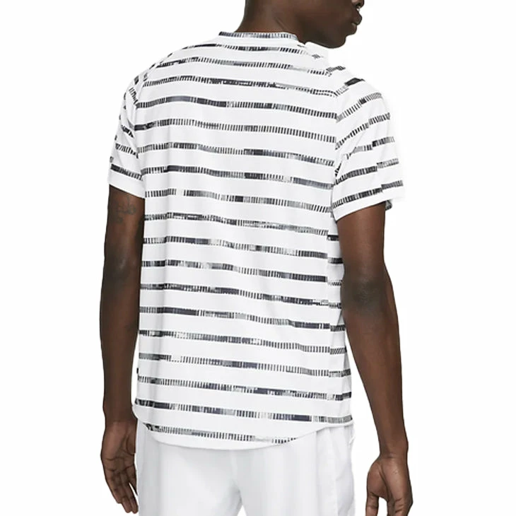 Stretchy and sweat-wicking, the NikeCourt Dri-FIT Victory Top is built to keep you comfortable during your toughest matches. A digitized stripe pattern brings a modern edge to a classic look. This product is made with 100% recycled polyester fibers.